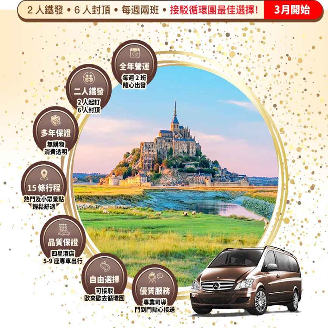 3.歐洲旅遊有別於世界其他國家,大部份旅遊景點是商務車不能直達,需要徒步參觀。如旅客是行動不便者,在某些景點只能留在車上等候,不方便隨團參觀;損失的景點,亦不可以此藉口要求賠償退款;參團前敬請留意及三思,一經報名落實,亦代表接受我社此份條款。