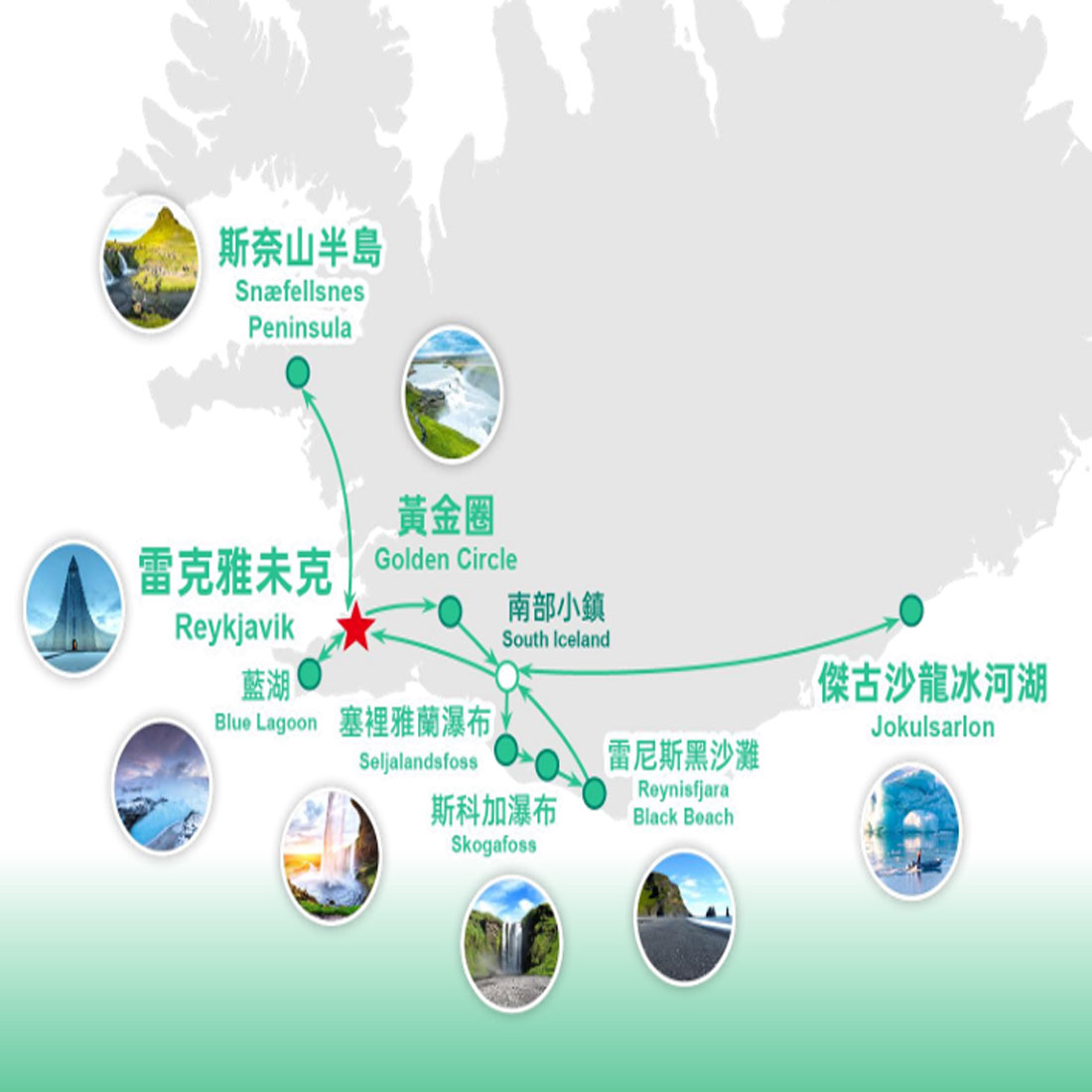 ●集散地點:第1天 : 冰島凱夫拉維克國際機場 (KEF) 機場大堂 ( 免費接機 : 統一時段16:20 )