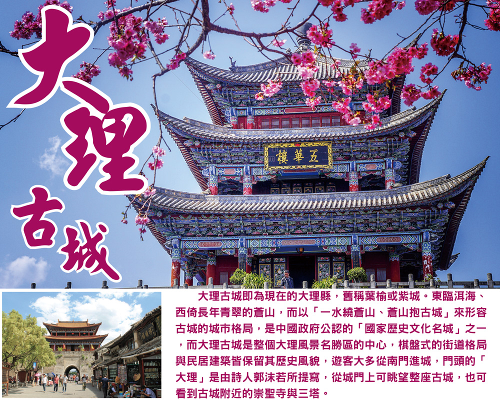 【大理古城】大理古城即爲現在的大理縣,舊稱葉榆或紫城,東臨洱海、西倚長年青翠的蒼山,而以「一水繞蒼山、蒼山抱古城」來形容古城的城市格局。大理古城自西元779年南詔王遷都陽苴咩城以來,已有1200多年的建城歷史,是中國政府公認的「國家歷史文化名城」之一。